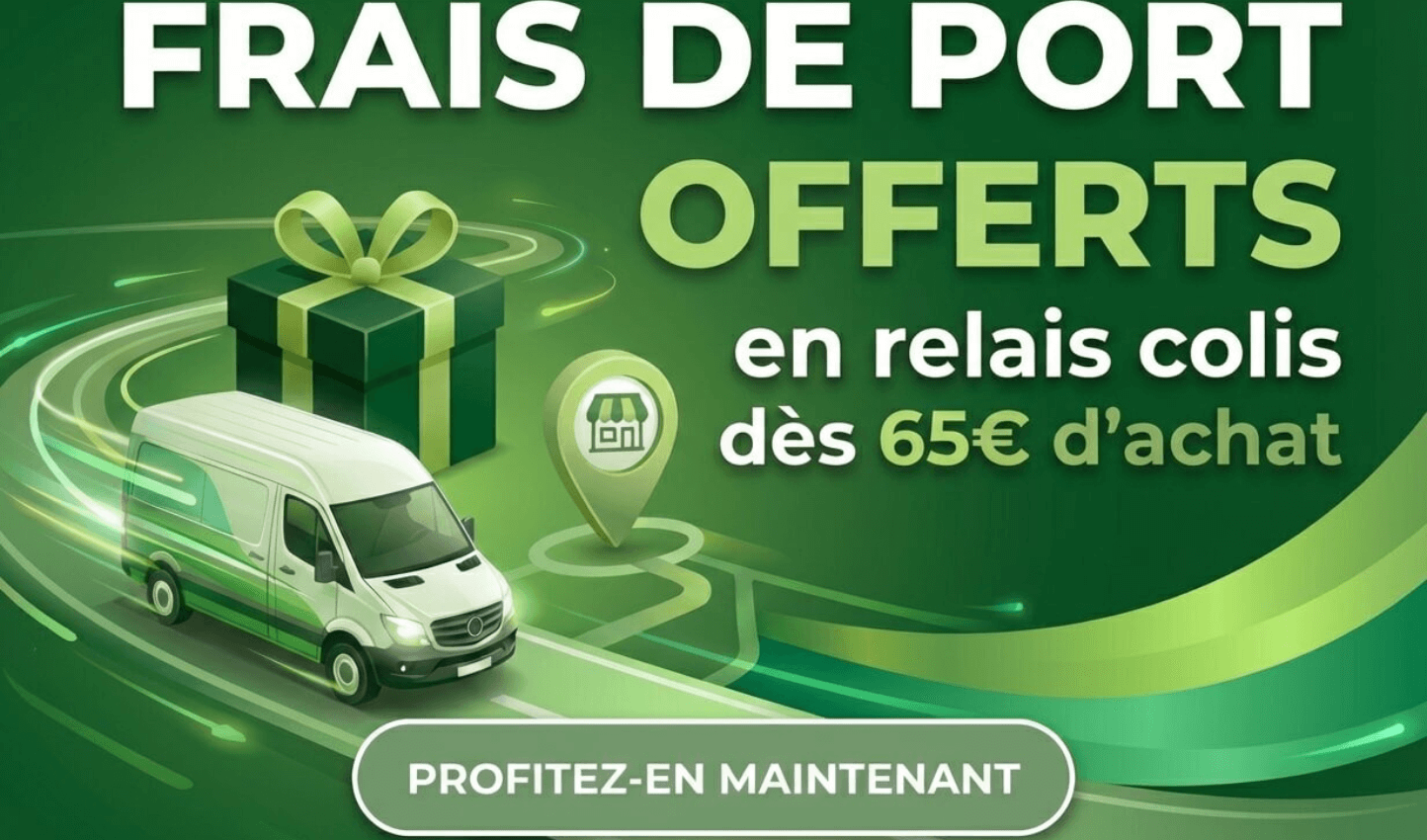 LIVRAISON OFFERTE EN RELAIS COLIS EN FRANCE METROPOLITAINE ET REDUIT A 5€ POUR LA BELGIQUE A PARTIR DE 65€ D'ACHAT